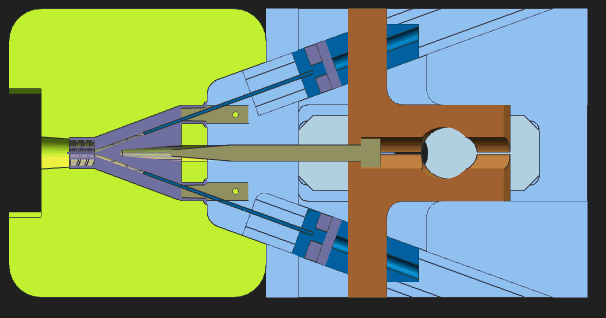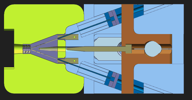 通過上面的圖例,我們可以清晰看出這個難點就在箭頭所指部位,高人高在他就先從對小孔入子做第一步抽芯(大孔型芯保持不動);小孔入子完全脫出后再帶動大入子繼續(xù)抽芯。